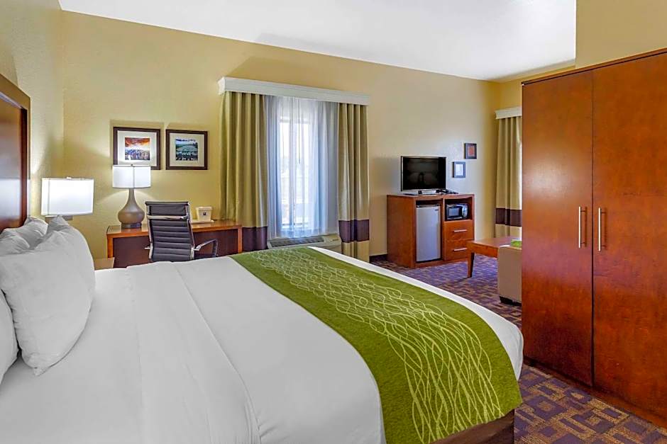 This room includes a work desk with ergonomic chair, a microwave and a refrigerator.
